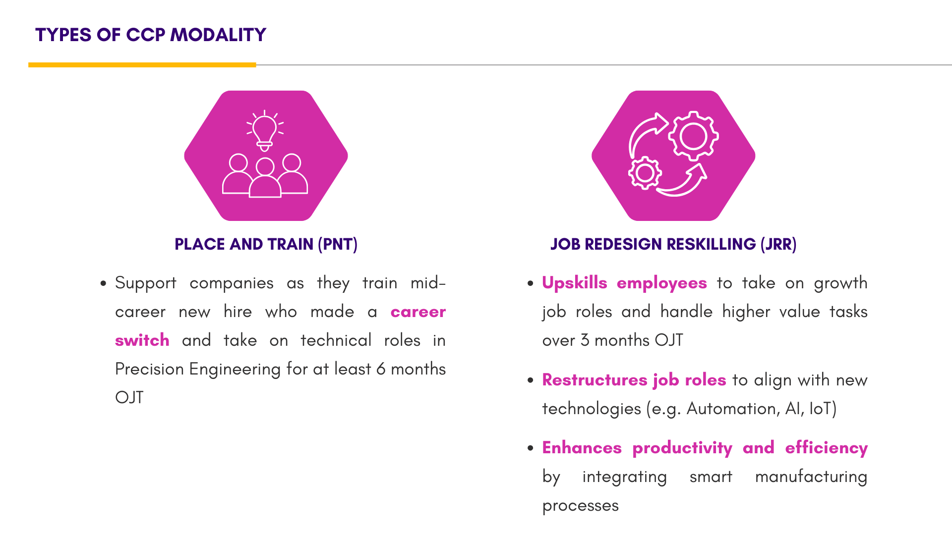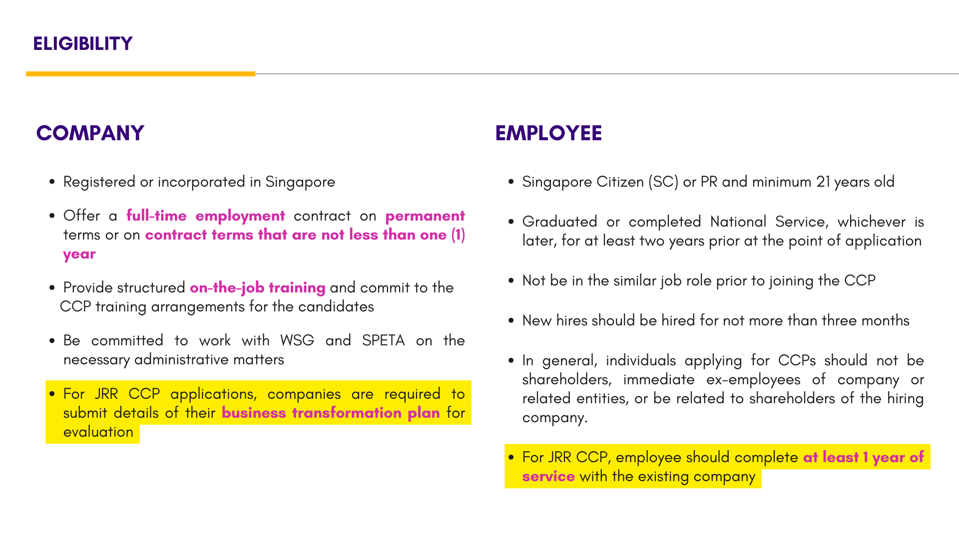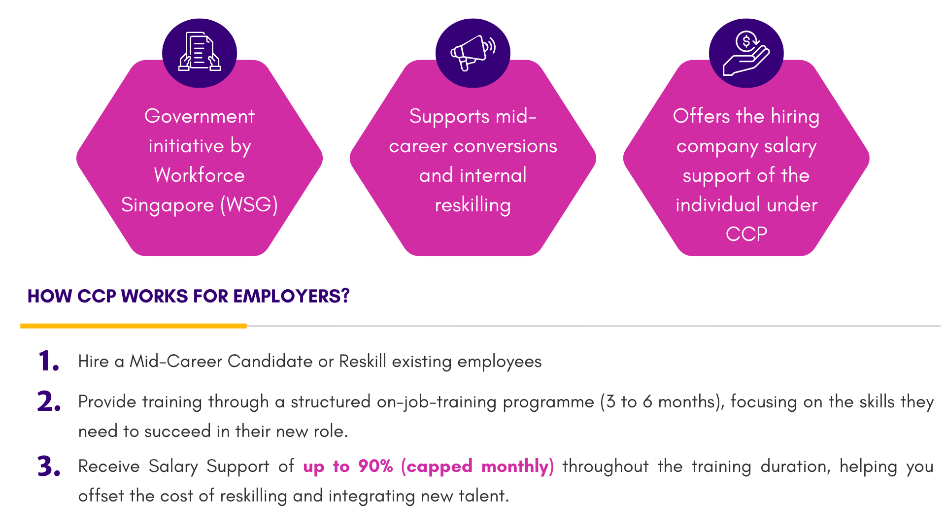 Whether you're reskilling mid-career new hires or grooming young talent, our government supported programmes can help you build a future-ready workforce. Explore how the Career Conversion Programme (CCP) and the Global Ready Talent (GRT) Programme can support your hiring and training needs.